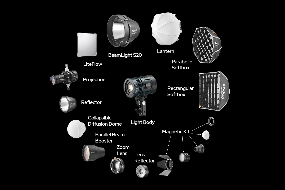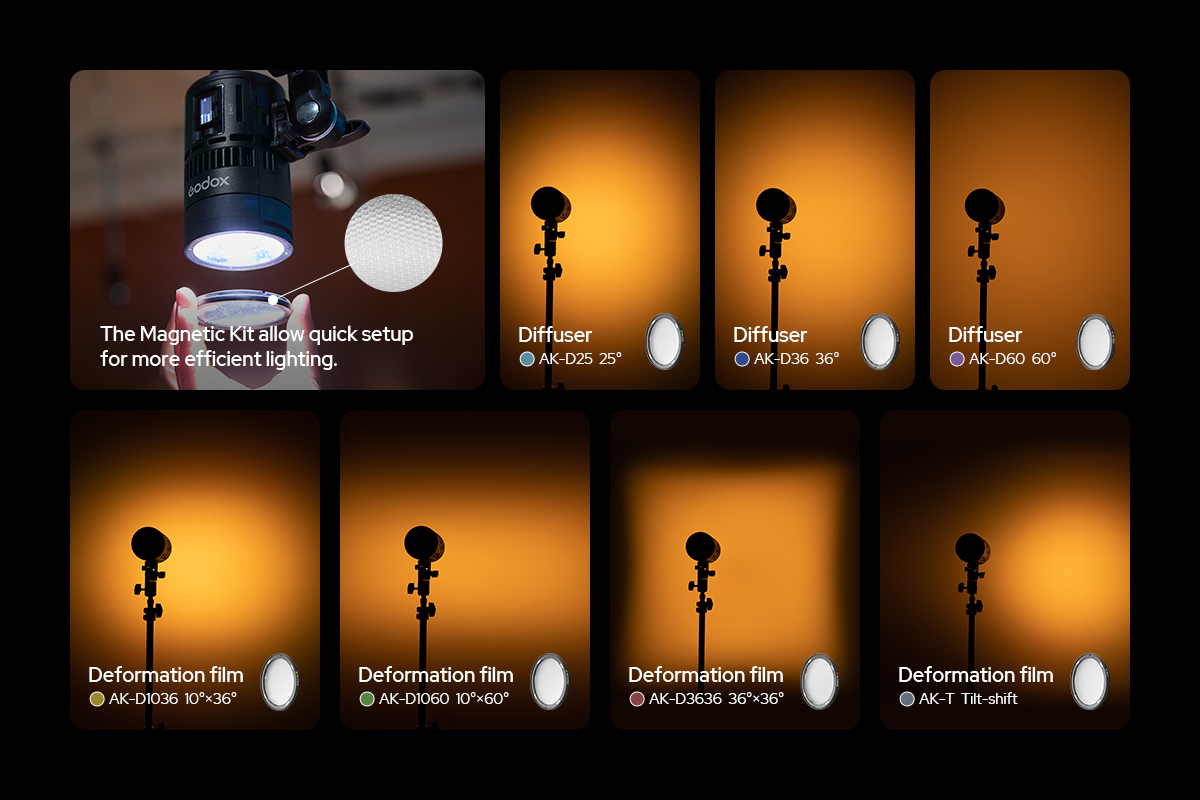 The magnetic kit feature Godox’s micro-optical design and work with lens reflectors to control light area and diffusion angle.