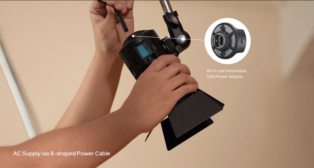The RS60 series offers versatile power options, including a fast-charging, removable battery for outdoor and mobile use.It also features the latest third-generation GaN semiconductors in the all-in-one detachable power adapter, offering higher power conversion efficiency in a more compact design—no more hassle with separate adapters. Simply plug in the 8-shaped power cable, or use the E27 socket adapter for seamless power supply, effortlessly integrating the RS60R/Bi into any scene as downlights, spotlights, or stage lights.