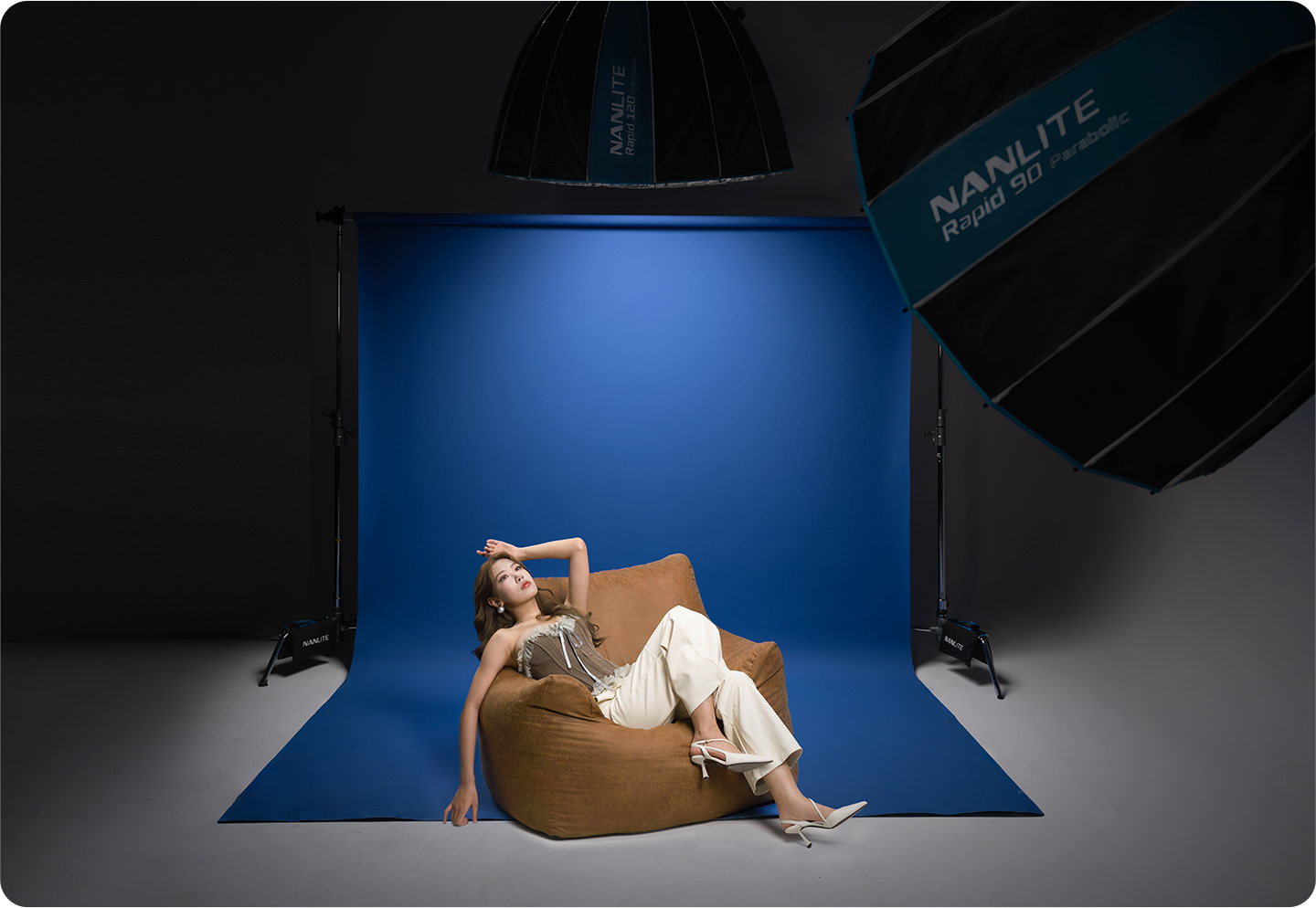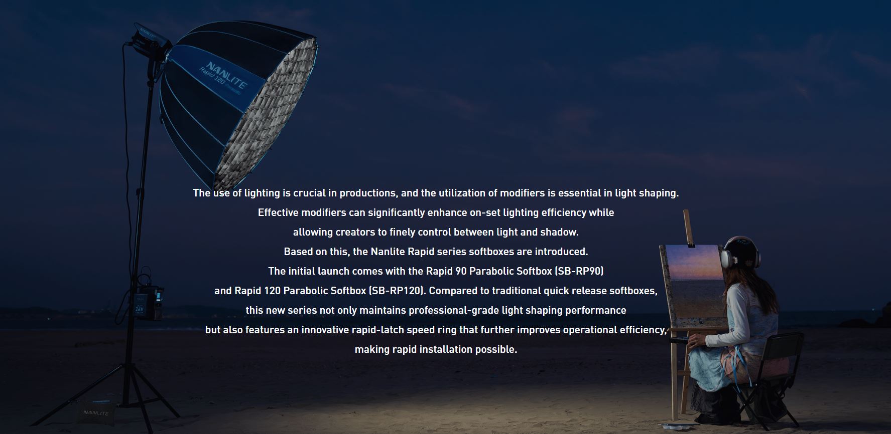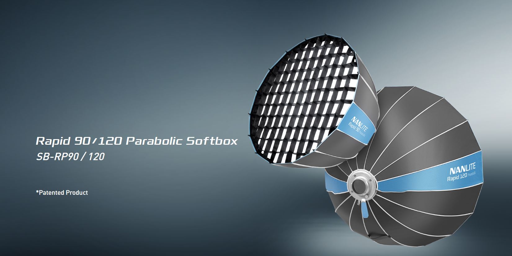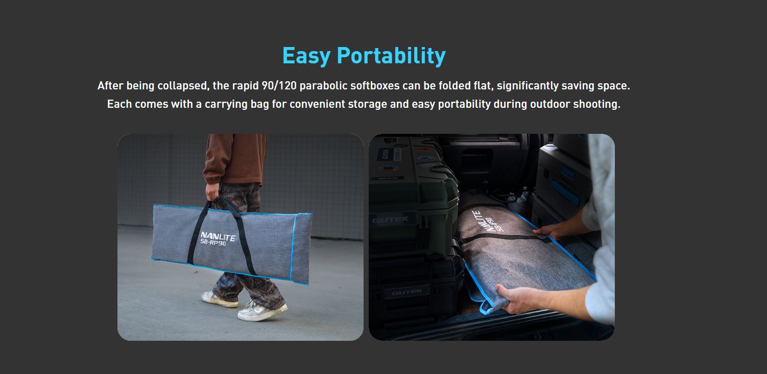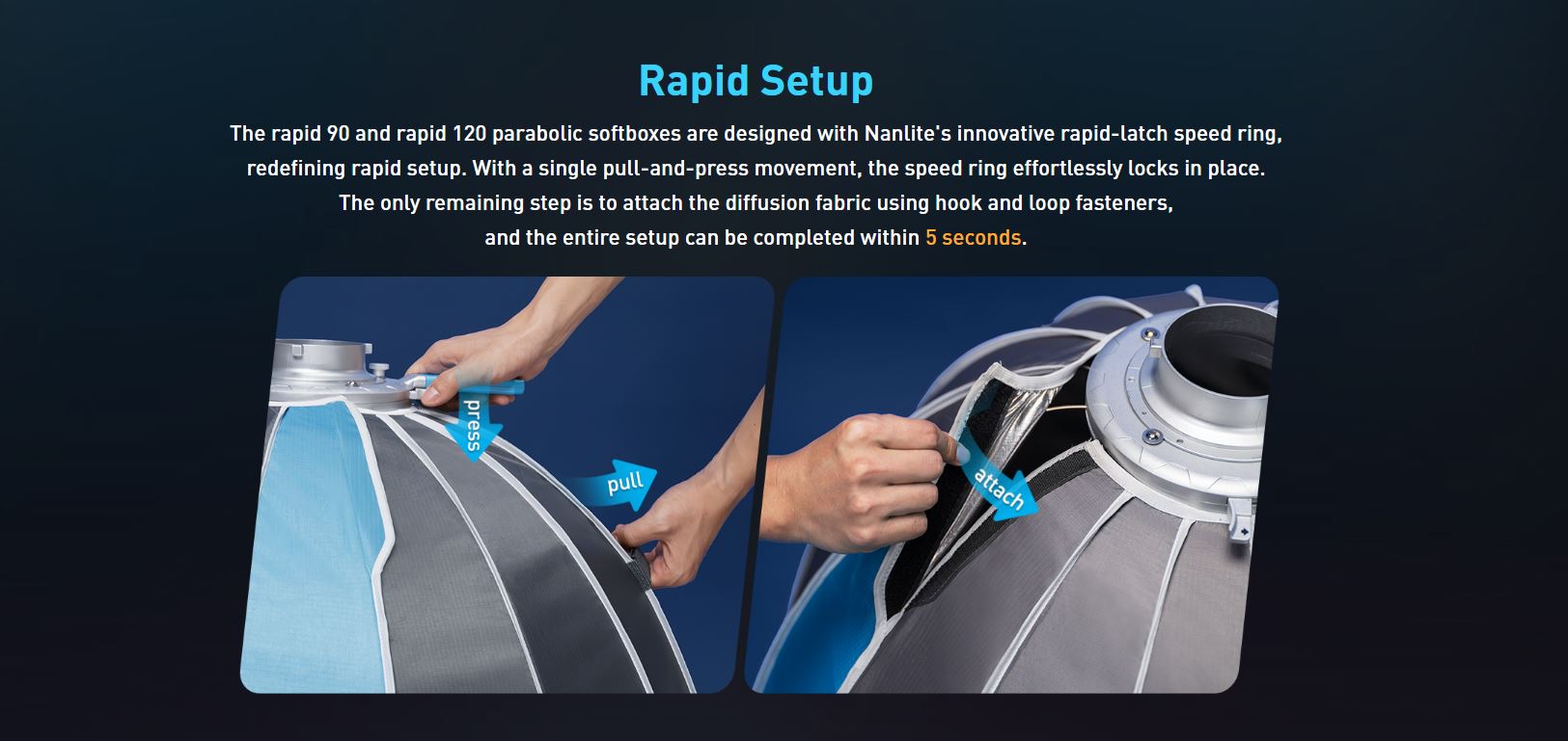 The interiors of the rapid 90 and rapid 120 parabolic softboxes feature reflective fabric that intensifies the light,