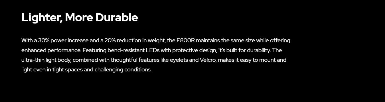 The F100R, F200R, F200SR, F400R models support V-mount battery power, while the F800R operates on 48V DC, making them ideal for mobile lighting setups or outdoor shoots away from power sources. Various lengths of AC and DC cables are available for added convenience (sold separately).