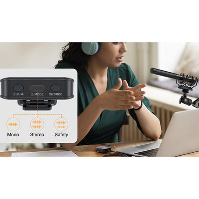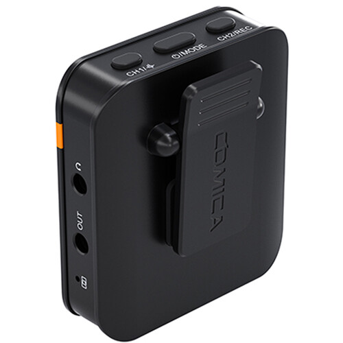 The receiver unit features a built-in back clip capable of mounting to your camera’s cold shoe, IPS display, USB-C output port, 3.5mm output, and 3.5mm headphone output to monitor your audio quality in real time. The USB-C port allows you to record digital audio or recharge the receiver’s built-in battery, which can run for 8 hours at a time. Onboard controls toggle between mono, stereo, and safety recording modes, as well as the de-noise function.