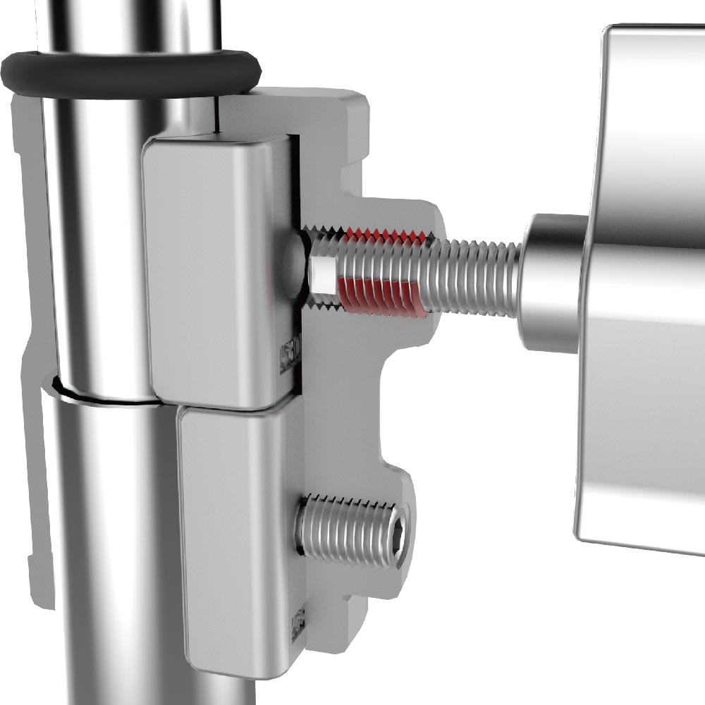 The 40″ grip arm with hex stud is a 2- 1/2″ grip head mounted on the end of a 40″ piece of steel tubing 5/8″ (16mm) in diameter and finished witha faceted hex stud to keep lighting fixtures in position when they are placed on the end of the arm . The surface of the tubing is painstakingly machined to create a rough texture to ensure a non-slip surface. The 2-1/2″ grip head consists of a pair of rotating aluminum discs attached to a 5/8″ (16mm) receiver . The discs have four different sized V-shaped jaws to accept any accessory witha 5/8″, 1/2″, 3/8″, or 1/4″ mounting stud or tubing. The V-shaped jaws have teeth that grab whatever is mounted between the plates securely. The 2-1/2″ grip head features an oversized ergonomic t handle and dedicated roller bearings designed for maximum torque.