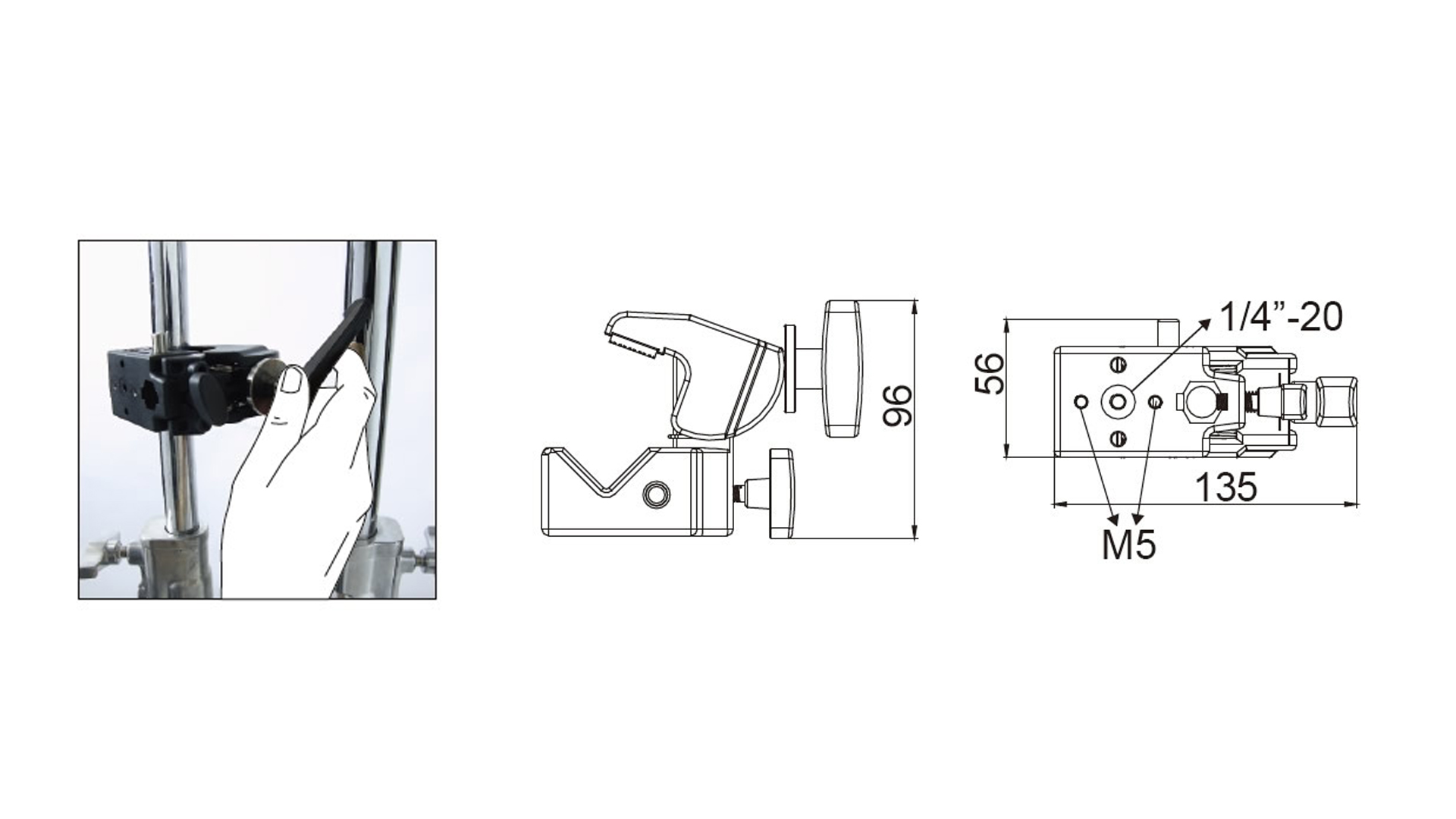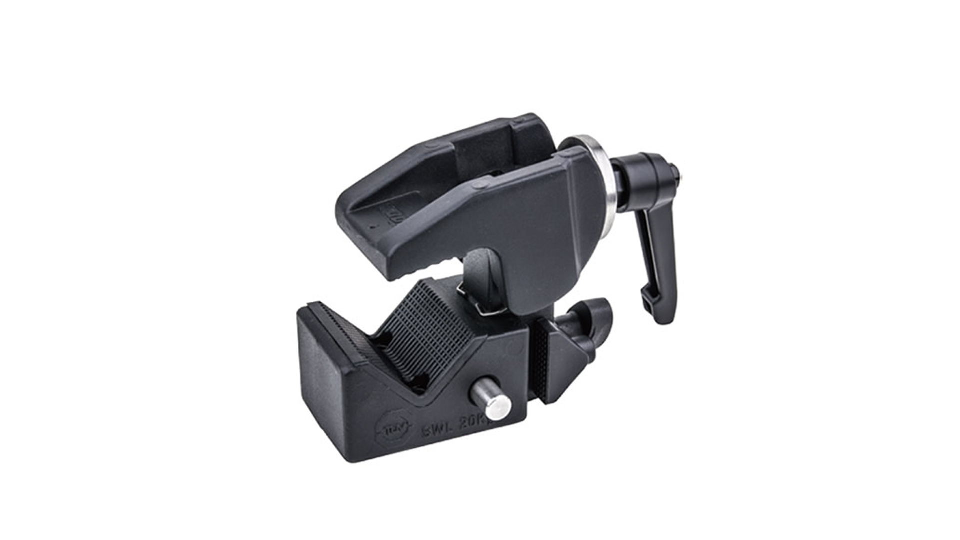 The Kupo Convi clamp TUV certification is more than just an amazing clamp, it’s the foundation of an entire grip system. The all-metal convi clamp is made from a lightweight alloy that will support loads of up to 44lbs (20kg). It features a hexagonal receiver that accepts dozens of convi accessories from a simple stud to the versatile max arm to mount almost any light fixture camera or accessory. The receiver features a spring locking safety system to ensure that the convi accessory won’t separate from the clamp if the locking screw loosens unexpectedly. The convi clamp has a jaw that will extend from 0.2″-2.0″ (5-51mm) in diameter. It also features a saddle to securely mount it on flat surfaces. This clamp has a ratcheted handle that allows you to reposition it should you not have clearance to rotate the handle in a complete circle to tighten or loosen it. It comes in a black finish.
