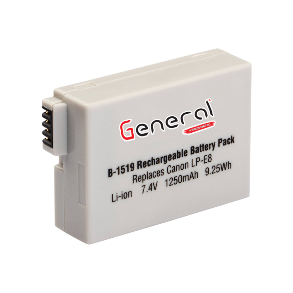 The General LP-E8 Lithium-Ion Battery Pack works with the same cameras as the Canon LP-E8. This replacement battery pack features a capacity of 1250mAh, 7.4V of output power, and 9.25 watt-hours. Small and lightweight, lithium-ion batteries can be charged or discharged at any time without developing memory effect.