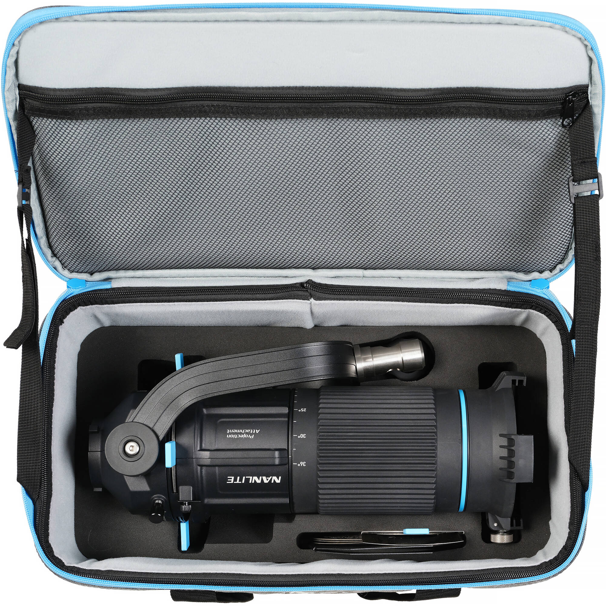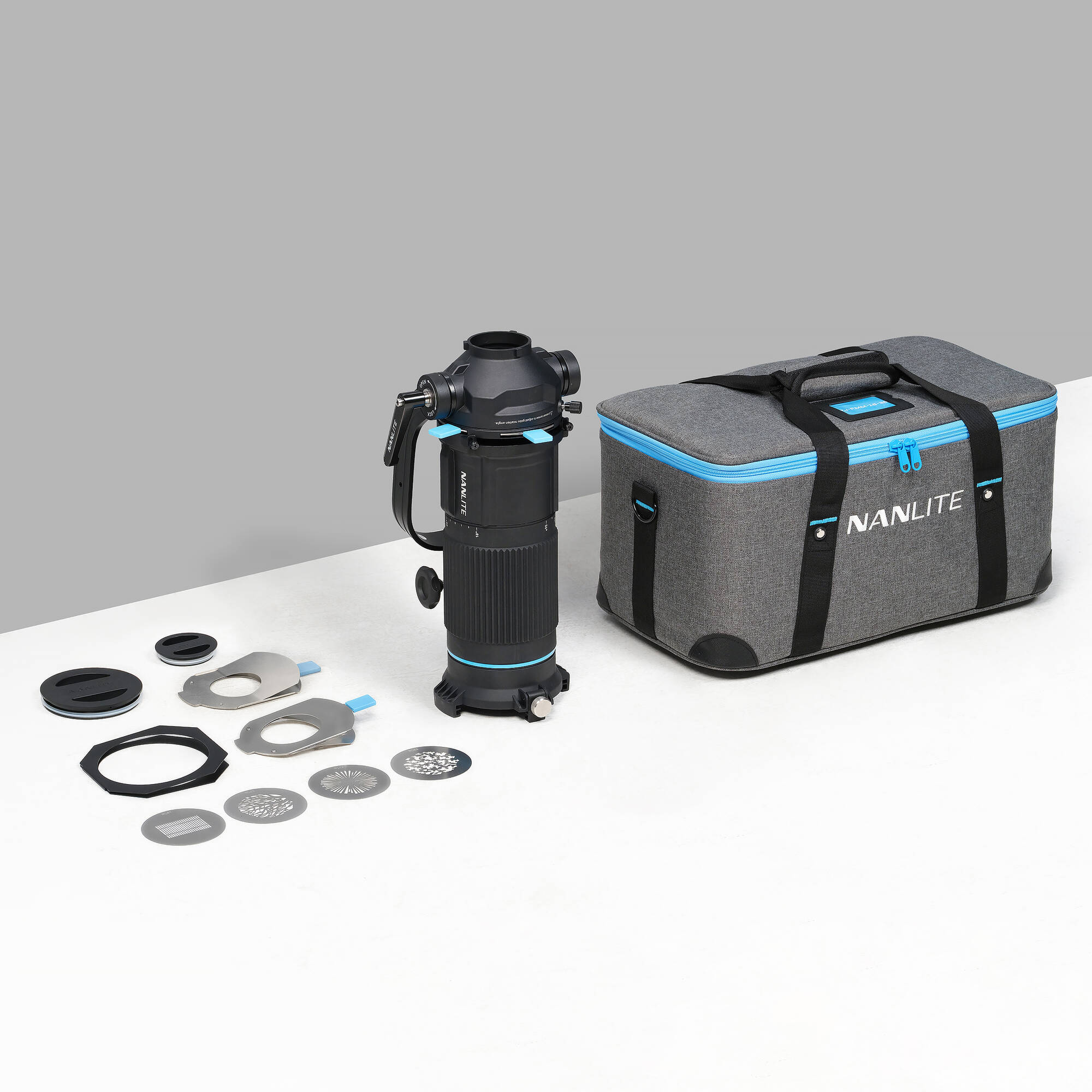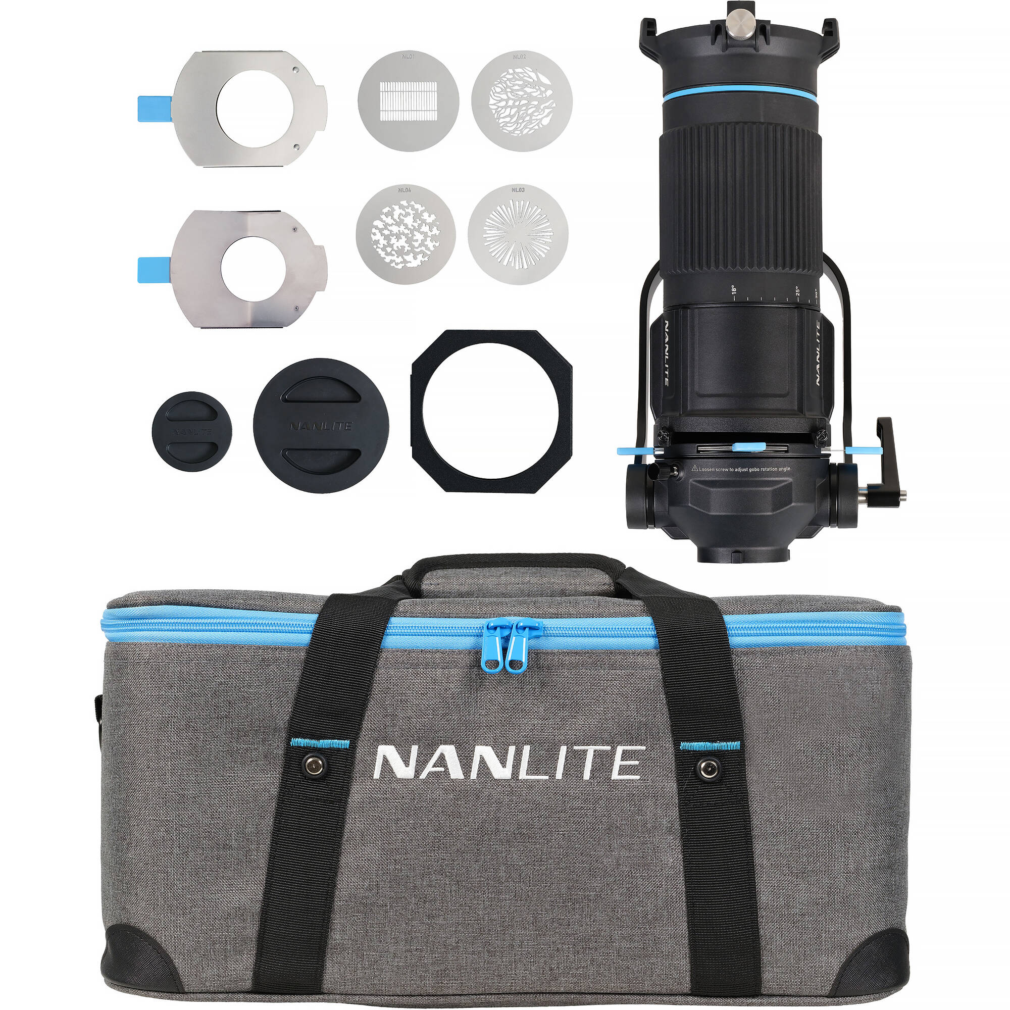 Achieve quality lighting and precise zoom control with the Projection Attachment for FM Mount with 18-36° Zoom Lens from Nanlite. This projection attachment is compatible with select Forza, FC, and FS fixtures with the brand’s proprietary FM mount. It enables a variable 18 to 36° beam angle, with a convenient optical system that increases illumination. Thanks to the 360° rotatable lens barrel, zooming does not require the removal of gobos or shutters. The locking handle allows tilt adjustments to find the exact position needed. A curved yoke offers wide compatibility with 1-1/8″ and 5/8″ optional stands.
