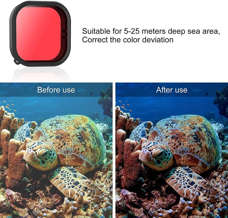 - Red filter correct color deviation and solve the problem of greenish color at the depth of 12 to 85 feet